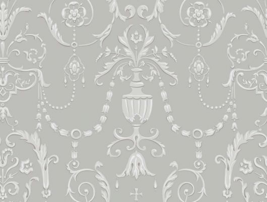 Фрагмент классического интерьера с декоративной вставкой из обоев Regalia серого цвета с изящным жемчужным узором. Обои фабрики Cole & Son в интернет-магазине, бесплатная доставка.