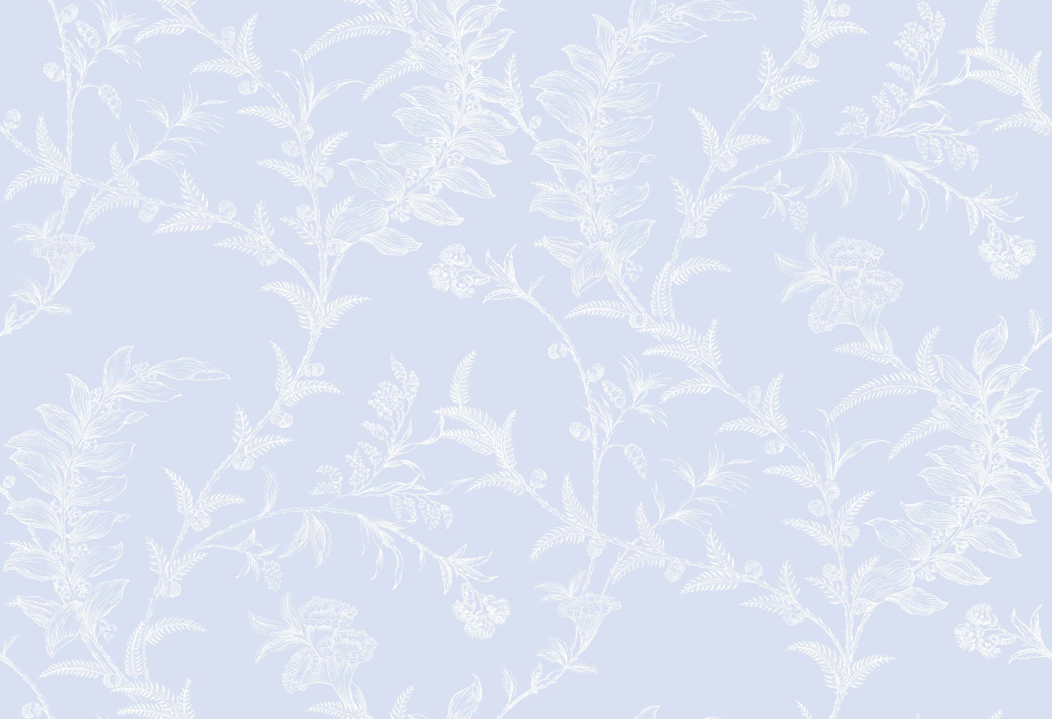 Обои Dialytra с вязью узора из стилизованных листьев и трогательных колокольчиков белого цвета на бледно-голубом фоне. Большой ассортимент английских обоев в салонах Москвы.