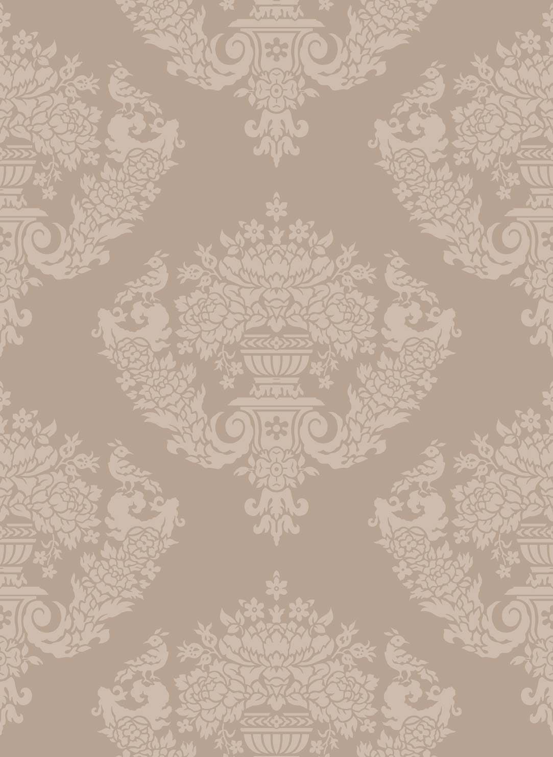 Обои Woolverston -  нежный белый дамасский орнамент на глянцевом фоне цвета капучино. Обои для гостиной, столовой, спальни. Купить обои в интернет-магазине, онлайн оплата.