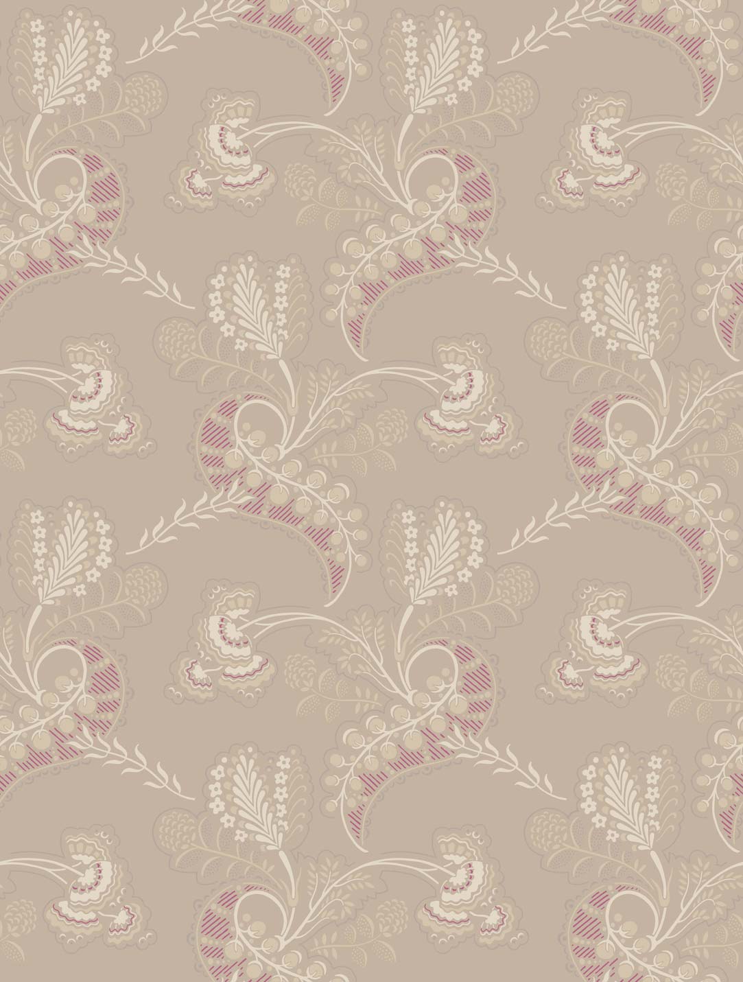 Обои Hartford от Cole & Son со стилизованным восточным орнаментом из цветов на изогнутых стеблях, миниатюрных плодов и резных листьев в оттенках кремового, розового и серебряного на серо-бежевом фоне. Обои для спальни, гостиной. Купить обои в Москве.
