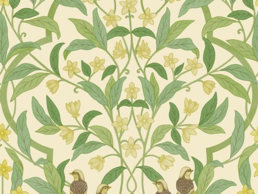 Миниатюрные канареечные вьюрки приютились среди жасминовых стеблей — современная версия изящного принта в стиле движения искусств и ремёсел. Объёмный и вместе с тем безмятежный рисунок в мягких ботанических оттенках. Расходясь веером по стене, обойный узор демонстрирует тонкие переходы цвета.