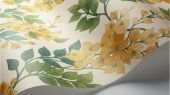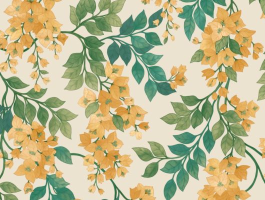 Флизелиновые обои пр-во Великобритания коллекция Seville от Cole & Son, переливающийся  цветочный рисунок желто-оранжевого цвета под названием Bougainvillea на светлом фоне. Обои для спальни, обои для кухни, обои для гостиной. Купить обои в салоне Одизайн, большой ассортимент, бесплатная доставка