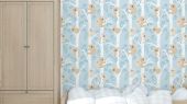 Интерьер детской в обоях с узором австралийского леса на голубом фоне