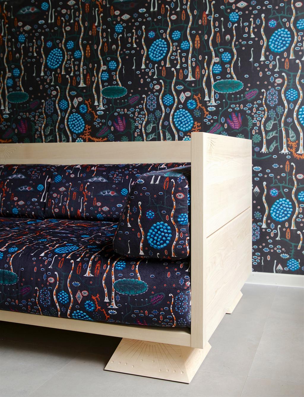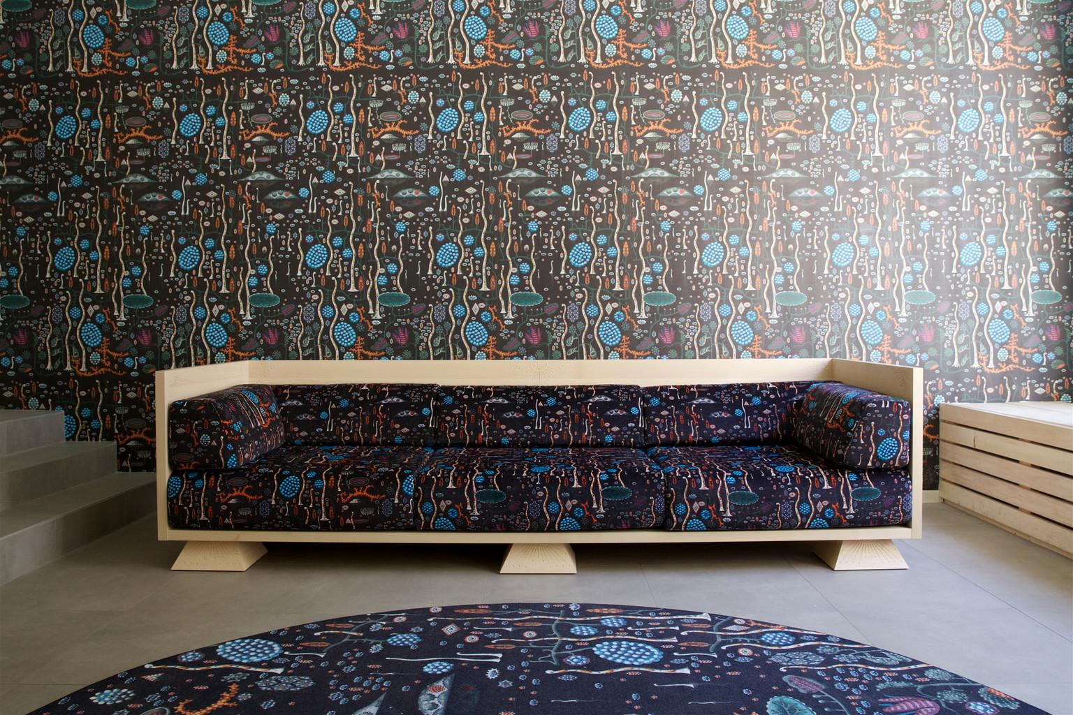 Диван изготовлен финской мебельной студией “Nikari”, гобелен соткан на английской фабрике в Бристоле, а круглый шерстяной ковёр изготовлен в Нидерландах.