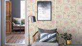 Интерьер гостиной с дизайнерскими цветочными обоями CLEMATIS нежно розового цвета на бежевом фоне
