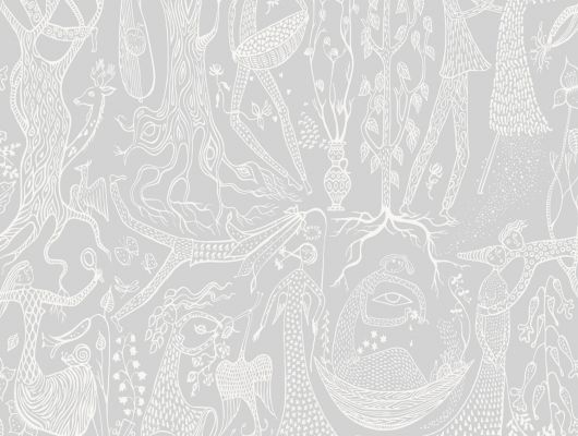 Флизелиновые обои из Швеции коллекция Scandinavian Designers II от Borastapeter, с сюжетным рисунком под названием Poem D'Amor на сером фоне.