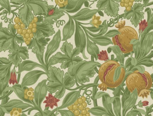 Дизайн в стиле движения искусств и ремёсел представляет собой живописную оду Помоне, римской богине древесных плодов и изобилия. На рисунке изображено множество фруктовых даров и садовых лоз из щедрого рога изобилия. Этот праздник природы и традиционного мастерства представлен в классических палитрах ботанических оттенков, а также в современных сочетаниях выгоревшего оранжевого с цветом чирка на чернильном фоне и цвета чирка с вергинье на джинсово-синем.