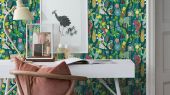Красочные обои от шведского производителя «Borastapeter» однозначно не позволят никому скучать. На оранжевом, синем и белом полотнах можно рассмотреть голубые цветы и рыбок, темно-зеленые стволы деревьев и хаотично сидящих на них людей. Кто-то играет на музыкальных инструментах, кто-то прячется под зонтом от дождя, а третьи просто наслаждаются происходящим. Дизайнерские полотна усыпаны паучками с их ажурными плетениями, развешенным на веревках бельем, фотопортретами и даже скворечниками! Неординарная смесь рисунков, их яркие тона подчеркнут индивидуальность каждого жилища. Обои предназначены для коридоров и кухонь, так как покрытие рассчитано на многочисленные влажные протирания. Шведские полотна «Melodi» создадут отличный декор, подарят заряд бодрости и хорошего настроения.
