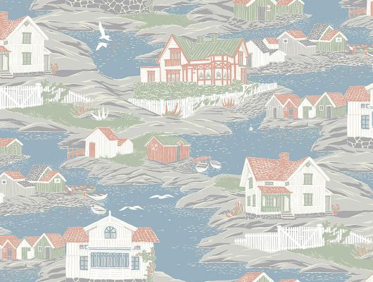 Продажа обоев для стен из Швеции с крупным рисунком, домики на синем фоне. Купить в интернет-магазине ОДизайн коллекция Marstrand ll Collection Archipelago бесплатная доставка