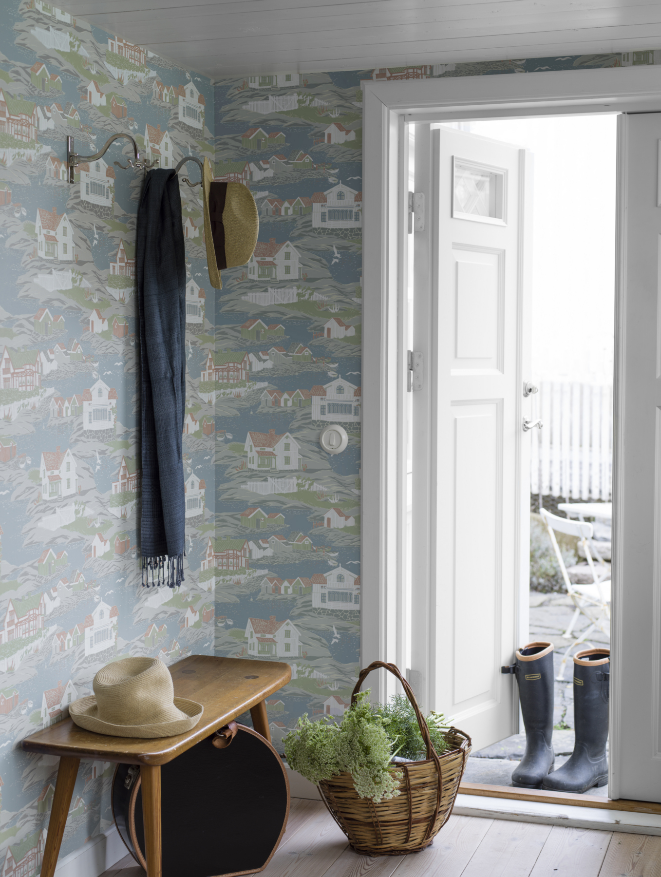Флизелиновые обои BorasTapeter в интерьере прихожей, из коллекции Marstrand ll Арт. 8850. Дизайн создан под впечатлением от простой приморской жизни и выполнен в глубоких пастельных тонах. Основным источником вдохновения стала архитектура шведского побережья с заботливо смастерёнными верандами и навесами. Обои BorasTapeter, Стоимость, заказать доставку.