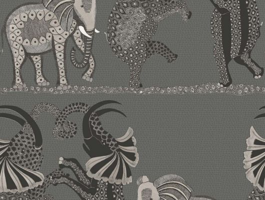 Эти красивые обои представляют нам трио слонов, танцующих вдоль африканской равнины. Мастерски выполненные изображения основаны на серии больших декоративных ваз художницы Зинхле Нене,чьи работы занимают почётное место в музее Ardmore. Здесь применяется довольно простая цветовая гамма — с целью показать изящество вручную нарисованных элементов. Угольные, песочные и светло-каменные оттенки формируют фон с лёгкими крапинками; на переднем плане используются чёрнобелые сочетания, мягкий тон шелковицы, цвет