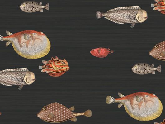 Плавающие в аквариуме рыбы очень успокаивают и поднимают настроение. Если вы еще не обзавелись живыми рыбками, украсьте комнату дизайнерскими обоями работы Форназетти с изображением удивительных морских обитателей, которые первоначально использовались им для оформления подносов. Забавная рыба-клоун и другие, не менее причудливые рыбы на стенах сделают вашу гостиную, столовую или спальню похожей на огромный аквариум, за жизнью которого так приятно наблюдать! На угольно-черном фоне рыбки в желто-оранжевых тонах.