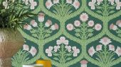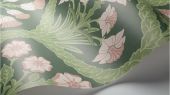 Узор обоев FLORAL KINGDOM Ballet Slipper & Leaf Green on Forest создан в неоготическом стиле в ручную. Из переплетённых листьев формируются смягчённые контуры килевидных арок, в центре которых расположены растения, символизирующие части Соединённого Королевства: весенние нарциссы — Уэльс, ароматные розы — Англия, раскрывающиеся розетки чертополоха — Шотландия, нежные веточки трилистника — Северная Ирландия. На выбор предлагается четыре варианта оформления в элегантных оттенках ботанической палитры.