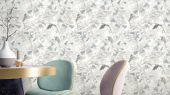 Обои флизелиновые Fardis PARADISE Lucia, для гостиной, для спальни, с райскими птицами и листьями на перламутровом фоне, купить в Москве, большой ассортимент, интернет-магазин обоев, оплата обоев онлайн, доставка обоев на дом