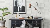 Фрагмент рабочего места на фоне обоев NORRKÖPING от ENGBLAD&CO в графичных серых оттенках. Обои в кабинет, гостиную Купить в Москве.