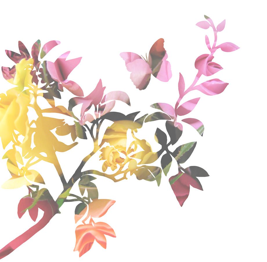 Фотопанно Silhouettes, Mr. Perswall с изображением силуэтов цветущей ветки и летящей над ней бабочки в технике, похожей на декупаж, зеленых, розовых и солнечно-желтых оттенков на белом фоне. Заказать фотообои для стен, большой ассортимент, бесплатная доставка.