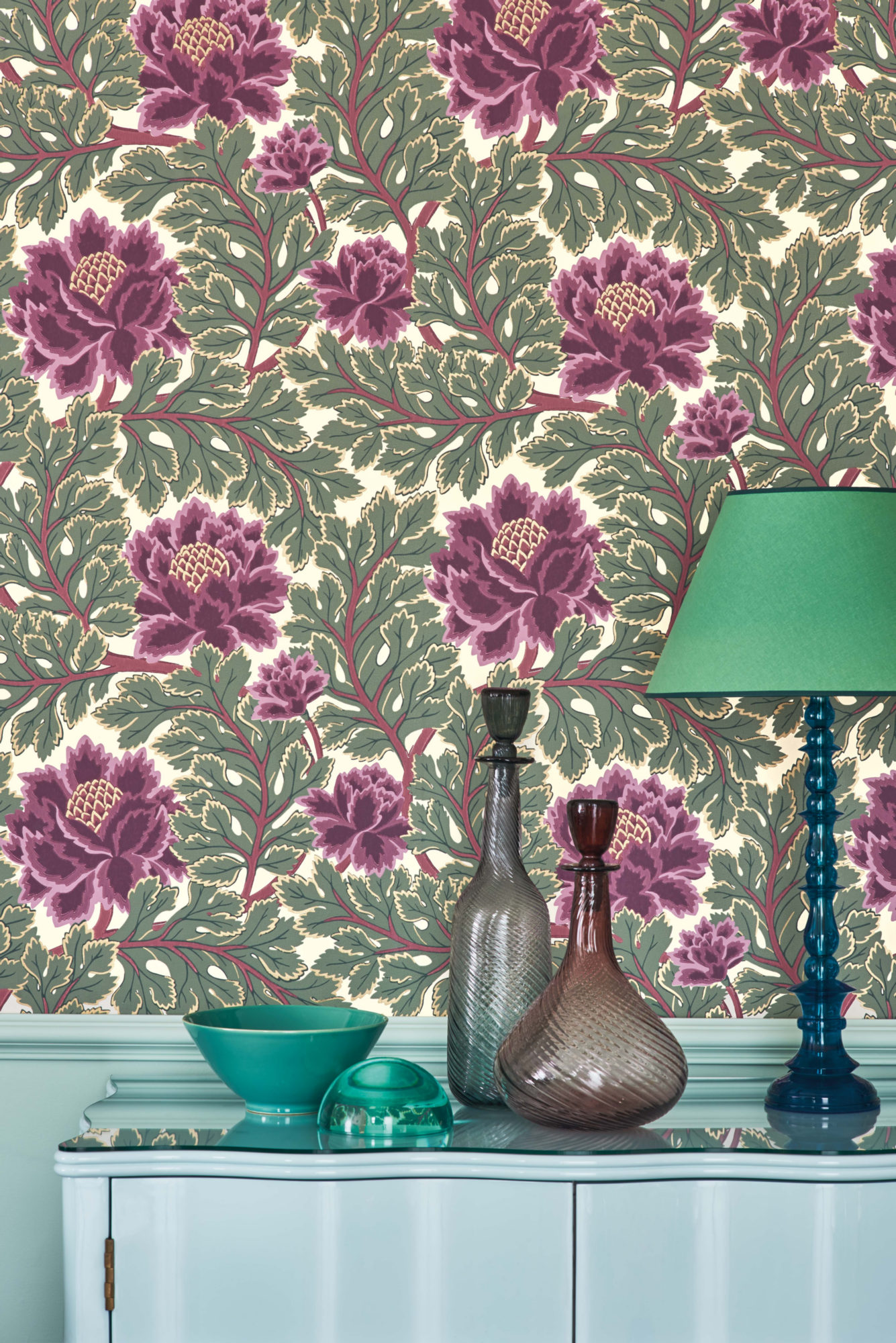 Английские обои AURORA от Cole & Son из каталога The Pearwood Collection артикул 116/1001 c растительным рисунком цветущих пинов фиолетового цвета и золотым окаймлением для гостиной.